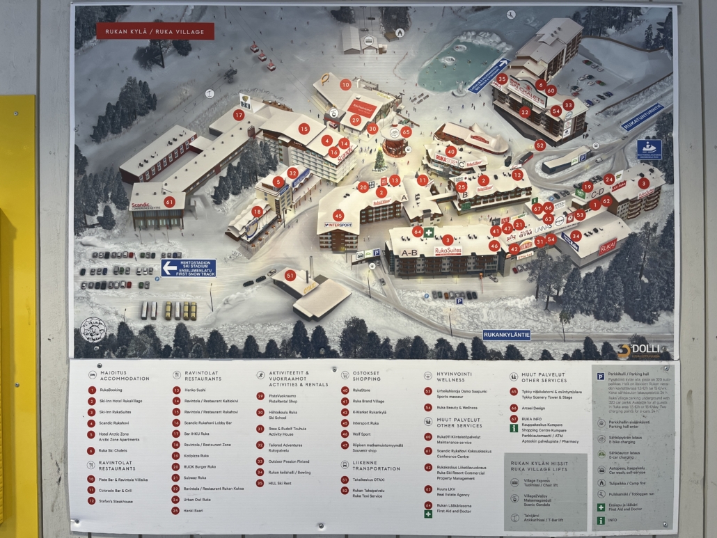 Heute ist ein Ausflug nach Ruka geplant, dort gibt es Ersatz. Wir sind viel zu früh vor Ort. Zuerst gehen wir in die Apotheke und schlendern durch das Village. Das Restaurant öffnet erst um 14 Uhr, also machen wir einen grösseren Spaziergang rund um Ruka.