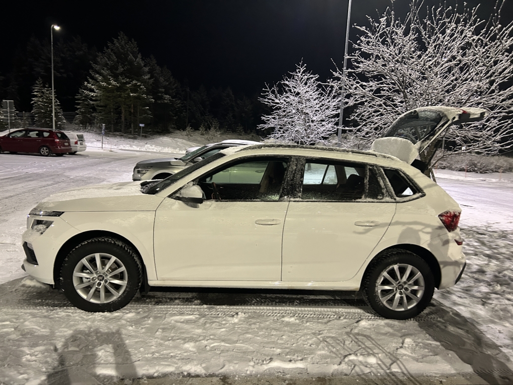 Wir holen unser Mietauto bei Avis ab (Skoda Kamiq DSG, weiss, Automat, 355 km). Die Fahrt dauert rund 25 Minuten, dann erreichen wir das Honkapirtti. Es ist spät und war ein langer Tag. Wir holen unsere Pyjamas hervor und schlüpfen müde unter die Bettdecke.