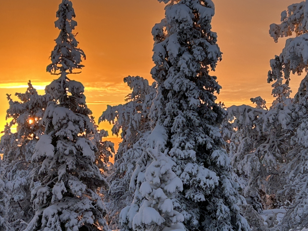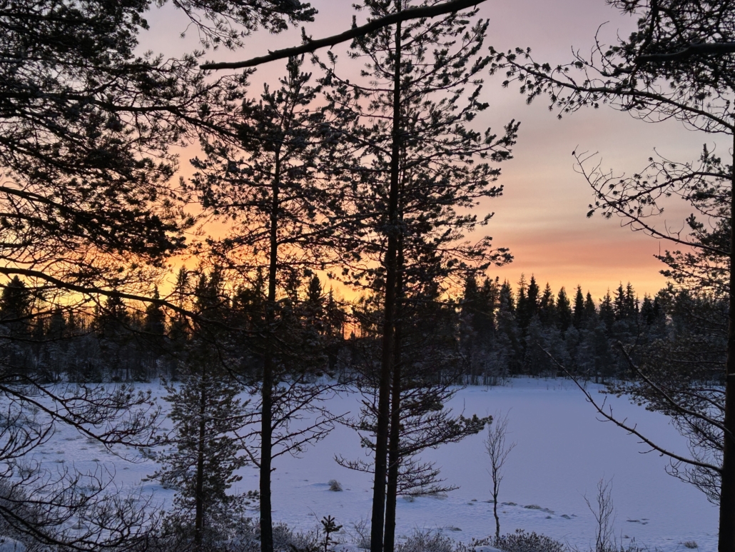 Wir erreichen den Parkplatz des Riisitunturi-Nationalparks pünktlich zum Sonnenaufgang. Bis wir jedoch startbereit sind, steht die Sonne bereits über dem Horizont. Der Beginn des Wanderwegs führt durch den Wald, sodass wir die Sonne nur durch einzelne Äste hindurch sehen.