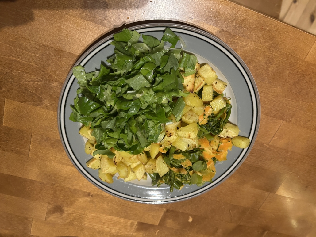Ich habe keinen Brokkoli bekommen, sondern nur Spargelbrokkoli (Bimi). Die Karotte ist leicht angefault. Auch dieses Abendessen verdient leider keine Bestnote.