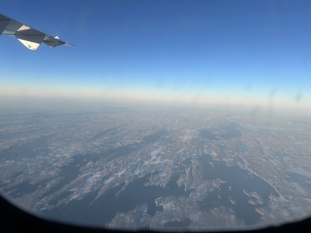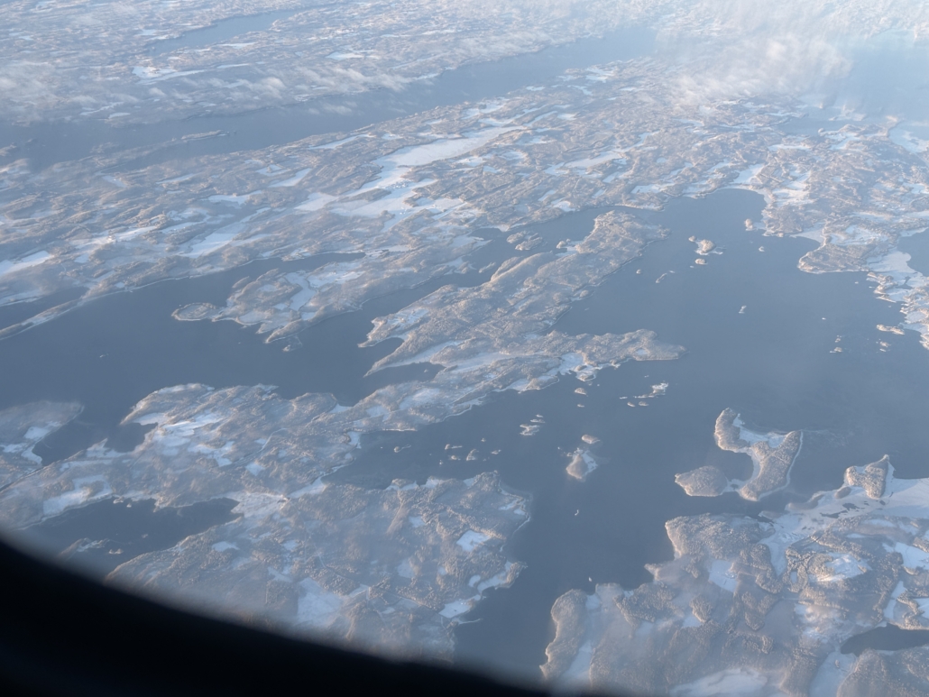 Während des gesamten Fluges haben wir gute Sicht nach unten. Allerdings sind die Fenster aussen mit Enteisungsflüssigkeit verschmiert, sodass keine guten Fotos möglich sind. Gegen 12 Uhr landen wir in Helsinki.