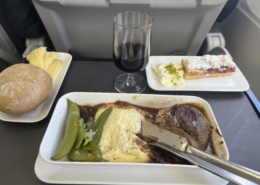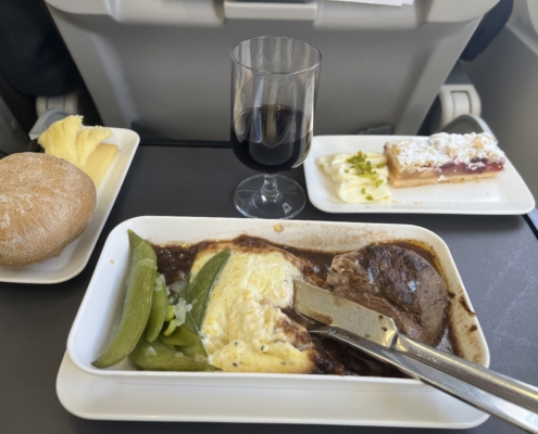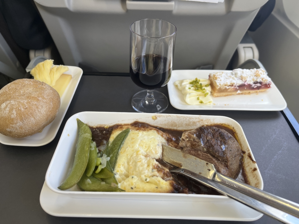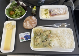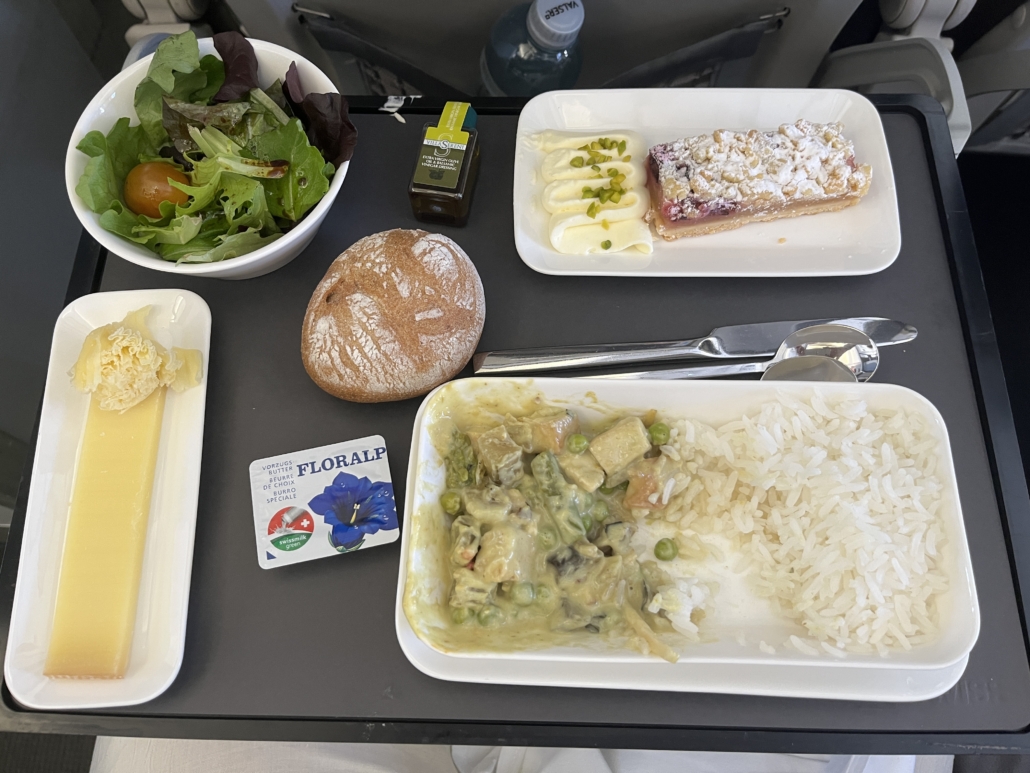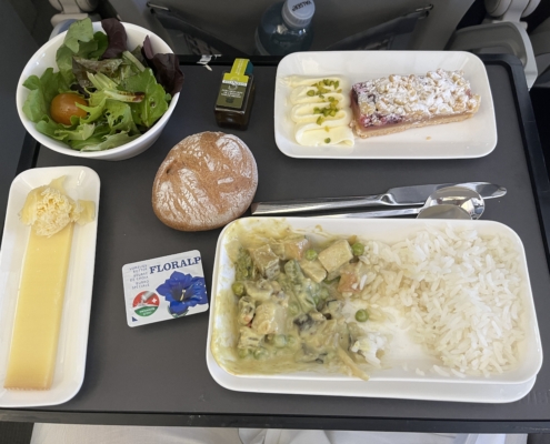 Die Business Sitzplätze sind vollständig belegt. Ein Crew-Mitglied fragt, ob wir vegetarisch oder Fleisch wünschen. Das Team wirkt noch nicht gut eingespielt – der Ablauf ist etwas chaotisch. Der Flug verläuft ruhig und bei schönem Wetter. Die Verspätung hält sich in Grenzen.