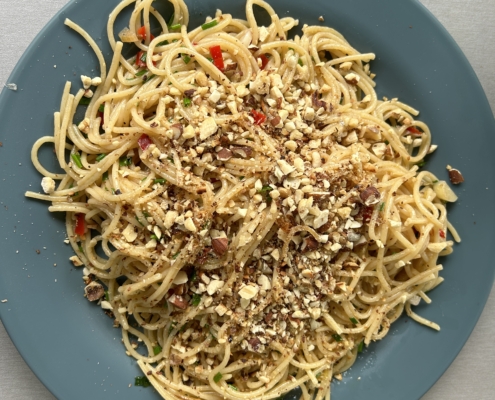 Am Vorabend haben wir kein Baguette bestellt, weil wir den Zopf essen wollen. Dieser ist trocken geworden, weil wir keinen richtigen Lagerort für Brot haben.
