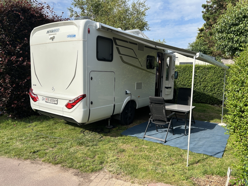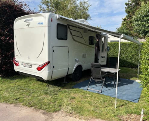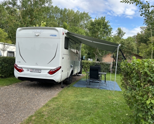 Am Morgen ist das Vordach nass, da wir es am Abend nicht mehr eingezogen haben, in der Annahme, dass wir draussen frühstücken können. Unser Stellplatz hat am Morgen noch Schatten und ohne Sonneneinstrahlung ist es noch frisch.