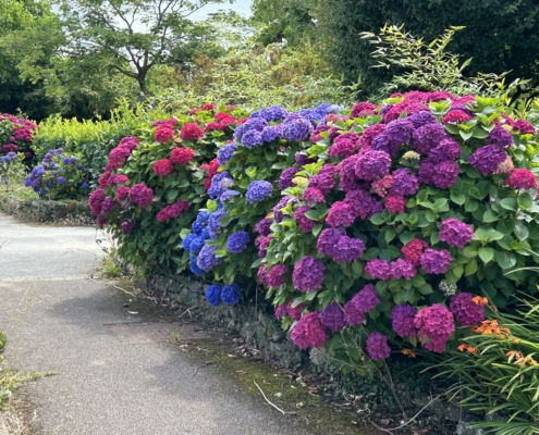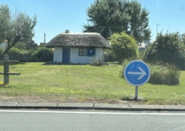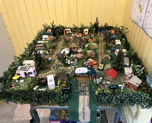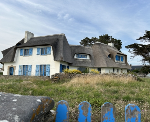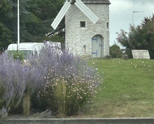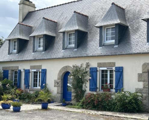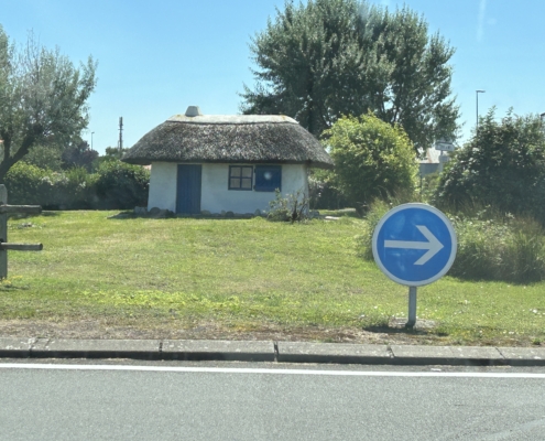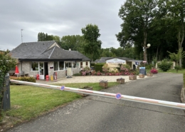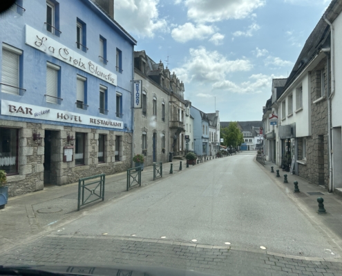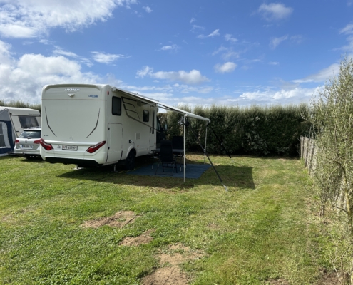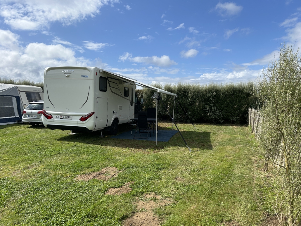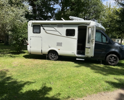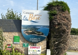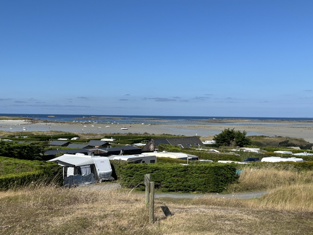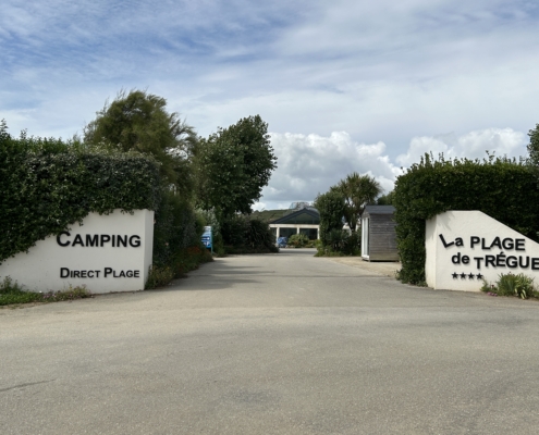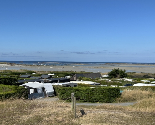 Ankunft im Camping Slow Village Breizh Légendes *** in Plouneour Trez ca. 17 Uhr. Die Empfangsdame versteht man kaum weil sie unklar spricht. Wir haben einige Probleme um die Schranke zu öffnen. Dann bekommen wir den Behinderten-Stellplatz in der Kurve in der alle durch müssen – Auto und Fussgänger. Die Strassen sind staubtrocken und jedes Auto wirbelt den Staub in unsere Richtung.