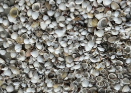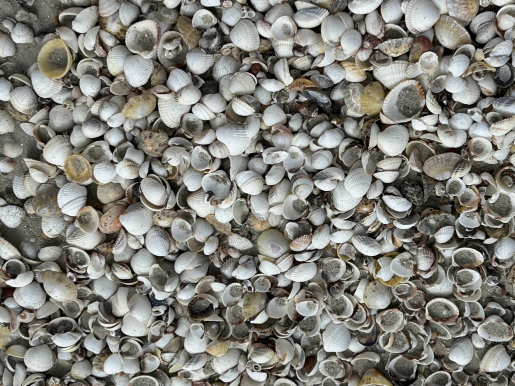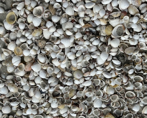 Um 12 Uhr ist die Flut am höchsten. Das Wasser ist eher flach, eignet sich nicht gut zum Schwimmen. Es wurden jede Menge Muscheln angespült.