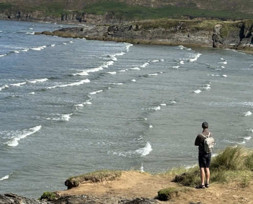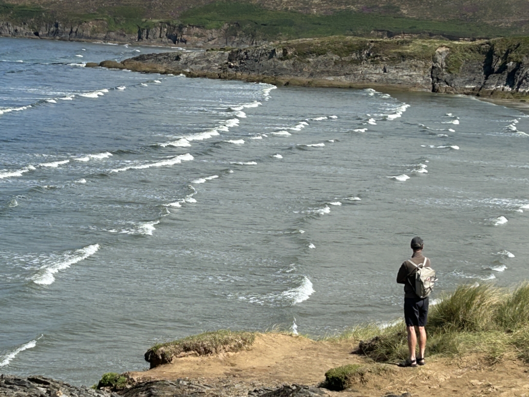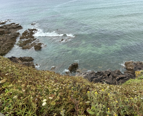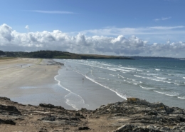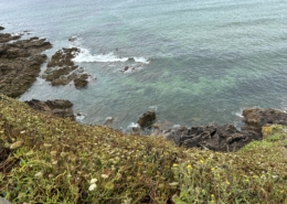 Nach dem Znacht wandern wir den Küstenwanderweg um die Landzunge. Es ist Ebbe und der Strand ist voller felsiger Steine.