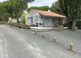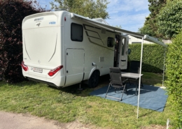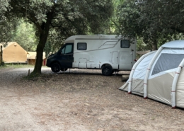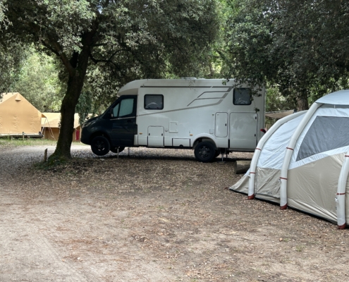Der nächste Programmpunkt ist einkaufen im Intermarché. Danach ist es nur noch ein kurzes Stück zum Camping municipal l’Orgatte **. Er befindet sich in einem Pinienwald, der Boden ist sandig. Unser Stellplatz ist leicht schräg.