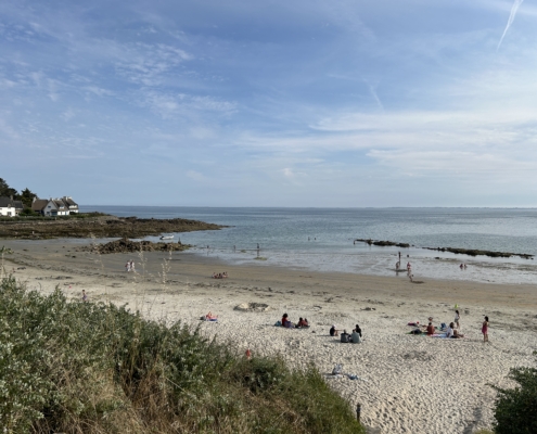 Das erste Ziel ist das Meer «Plage de Kerdallé». Der Strand ist sehr grob mit kleinen Kieselsteinen. Man kommt kaum vorwärts. Ein kurzes Bad und in der Sonne trocknen. Dann geht es weiter zum Mittagshalt in einem Wäldchen.
