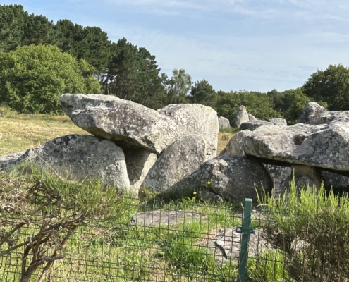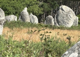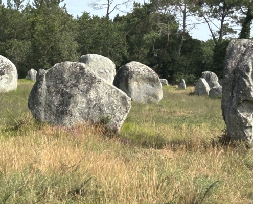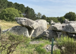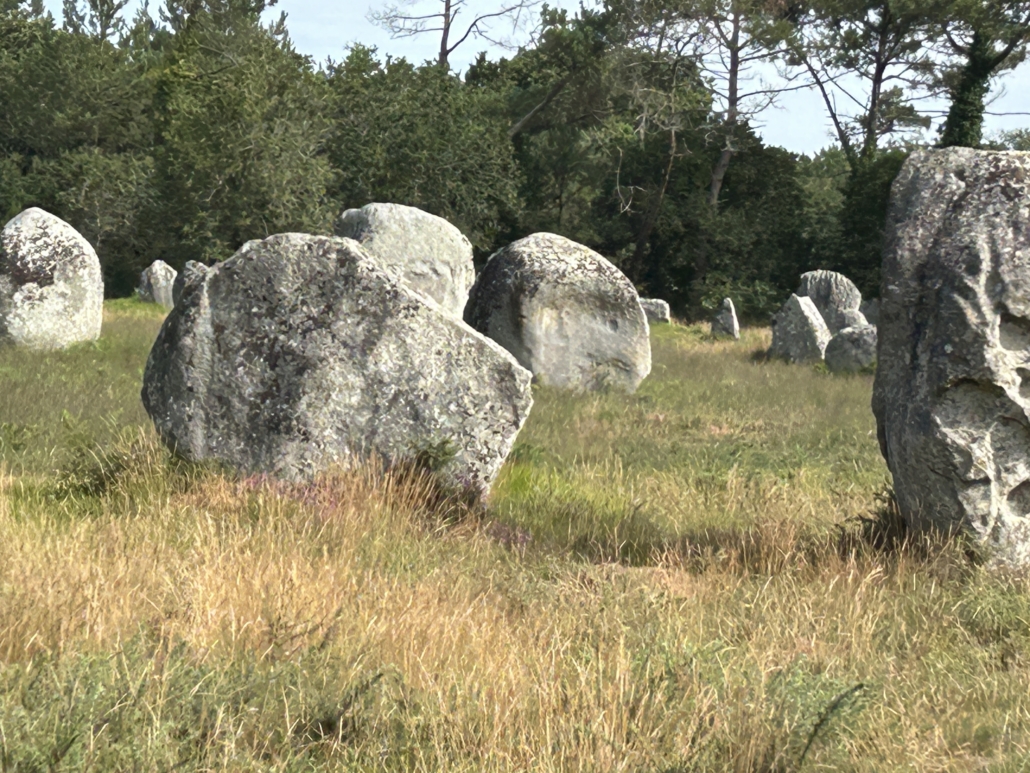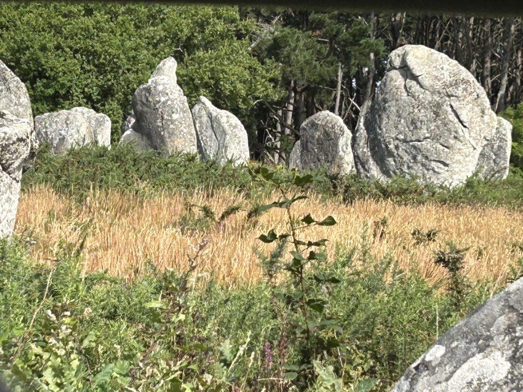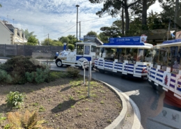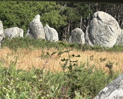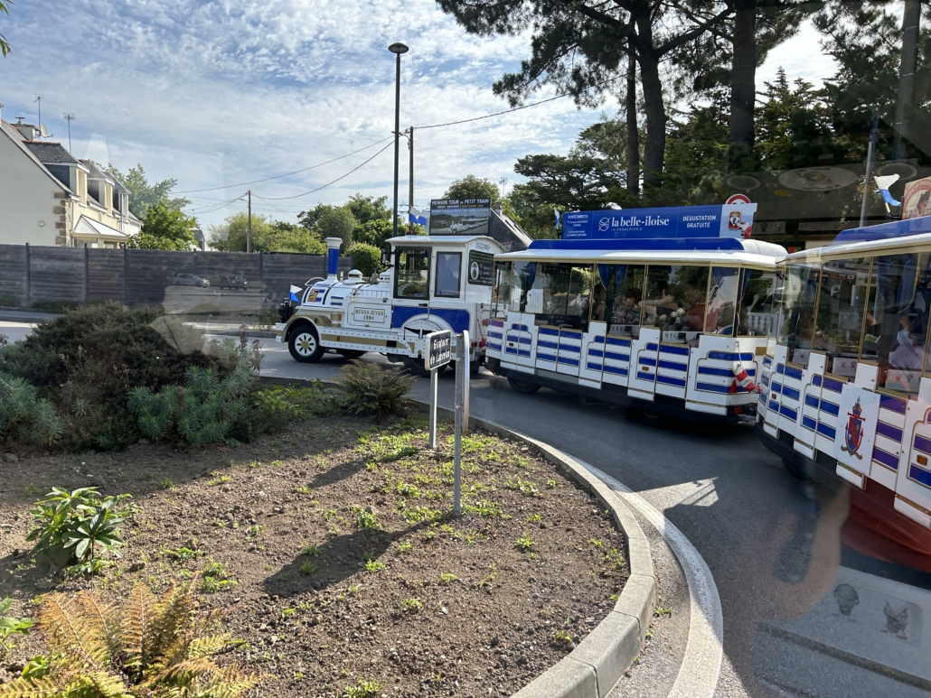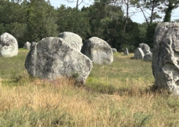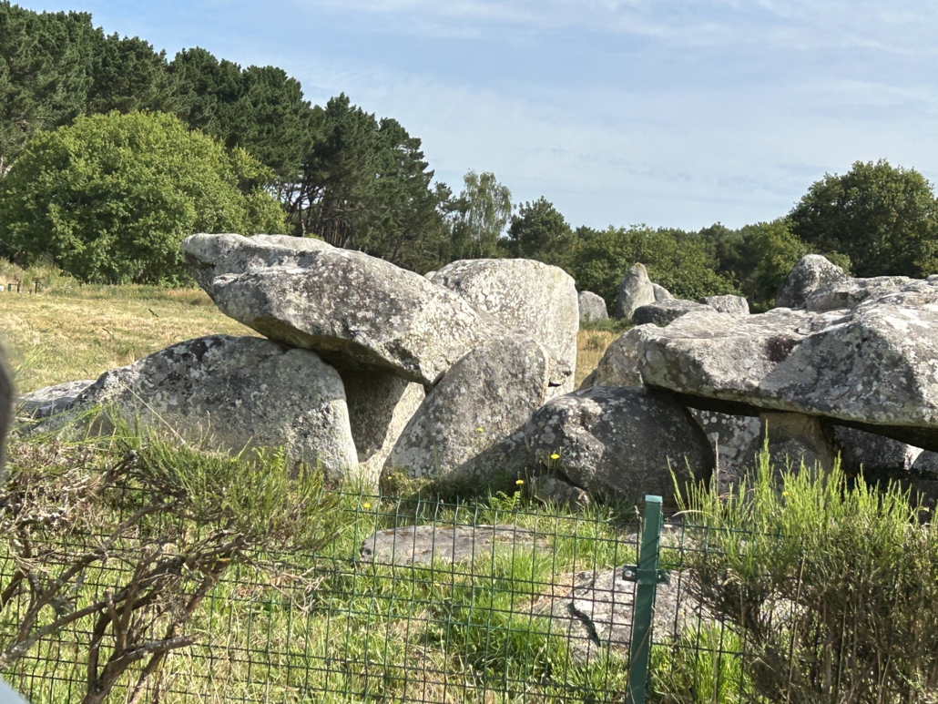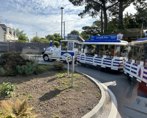 Heute wollen wir mit «le petit Train» die Mégalithes besuchen. Wir laufen 1,8 km zum Hafen von La Trinité-sur-Mer und warten auf den Zug. Es hat noch andere Passagiere. Als der Zug kommt ist er schon fast voll. Wir bekommen noch einen Platz. Die Fahrt dauert ca. 1 Stunde. Auf dem Rückweg zum Camping kaufen wir uns je 2 Kugeln Glace und 1 Stück Flan Kuchen.