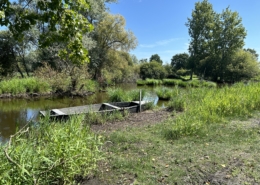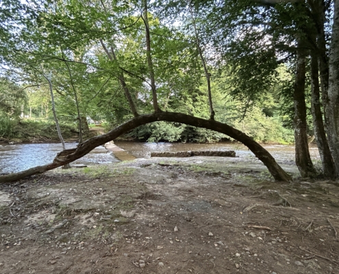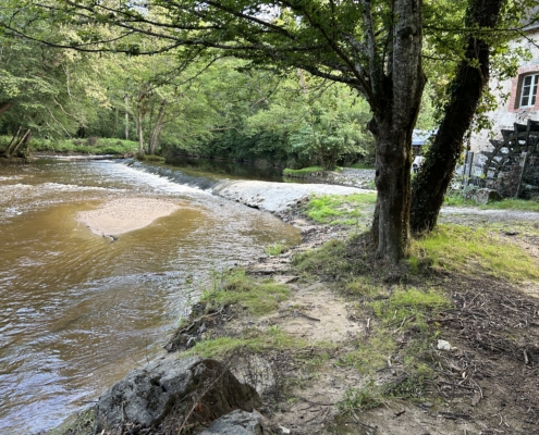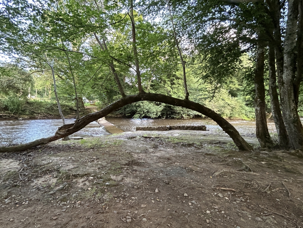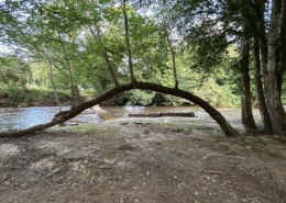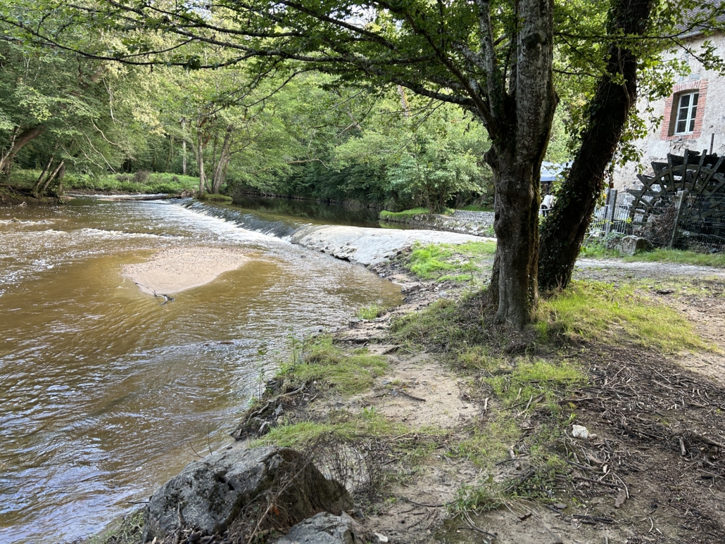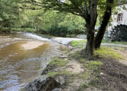 Wir schauen uns den Fluss und die Mühle an, ob man hier baden kann. Der Fluss hat Hochwasser und die Hängebrücke wurde durch einen entwurzelten Baum zerstört.