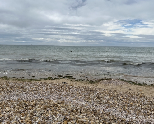 Am Morgen ist grosser Andrang bei der Entsorgungsstelle. Um 10:30 Uhr fahren wir los Richtung Mittagsrast im Wald. Dann geht es weiter zum Baden ans Meer. Das Navi sagt an der nächsten Ausfahrt abfahren. Nur es hat gar keine Ausfahrt. Wir nehmen die nächste und fahren zurück. Am Meer angekommen ist der Strand voller grosser Steine und grossen Muschelstücken. Die Schaumkronen sehen wir weit draussen bei einem braunen Meer.