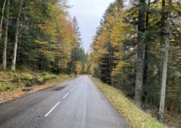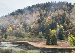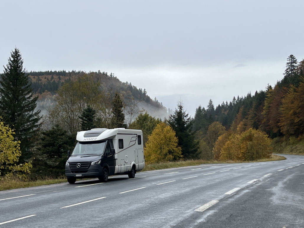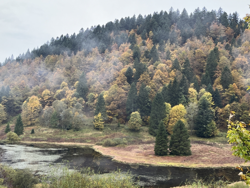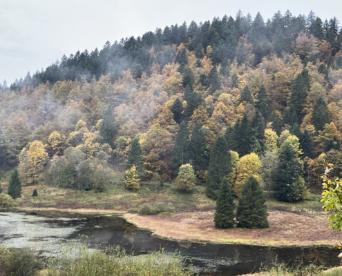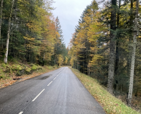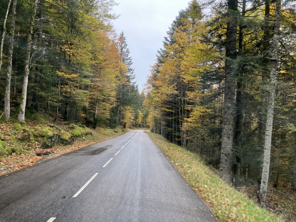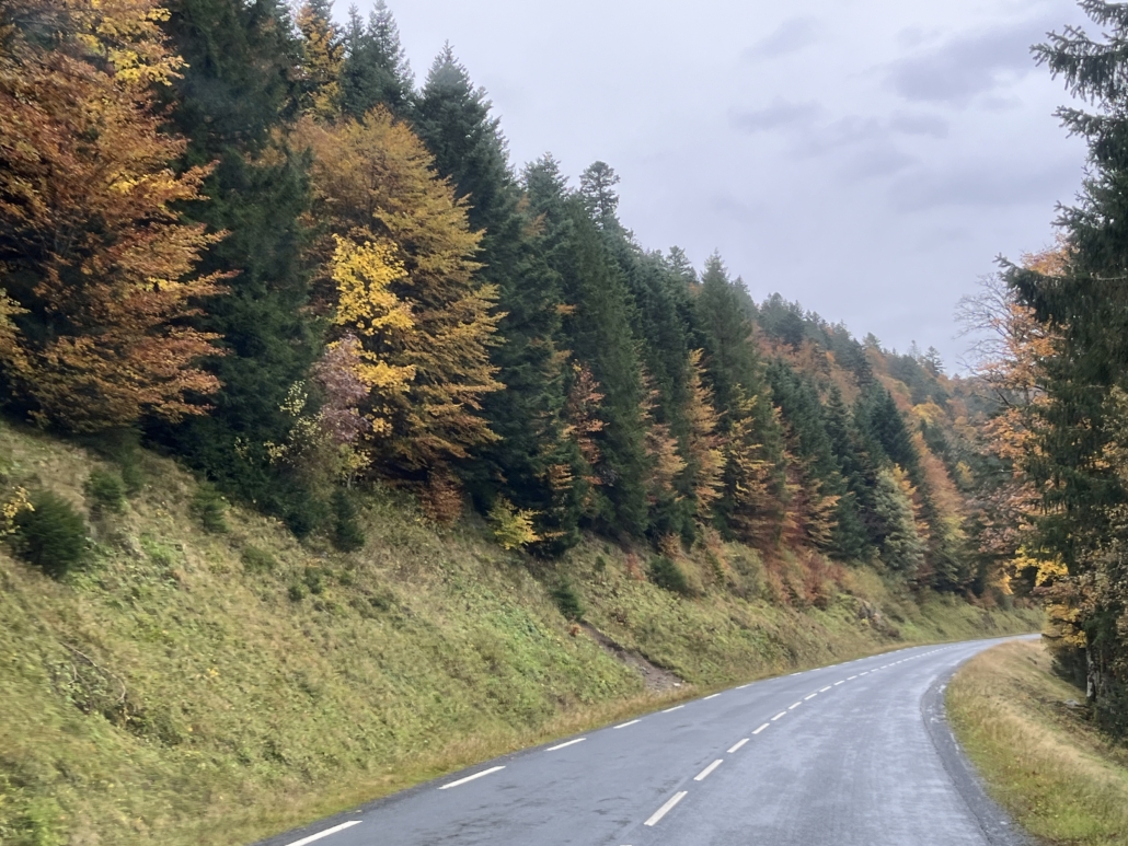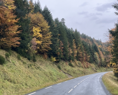 Heimreisetag. Frühstücken, abwaschen, alles einpacken und verstauen. Es ist 9:30 Uhr – wir fahren los. Durch den herbstlich schön gefärbten Wald fahren wir hoch zum Ballon d’Alsace. Von dort (1171 m) bietet sich uns ein umfassendes Panorama Richtung Schweizer Alpen.