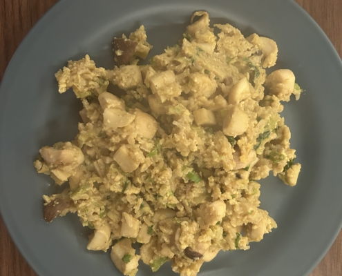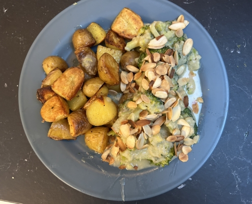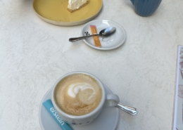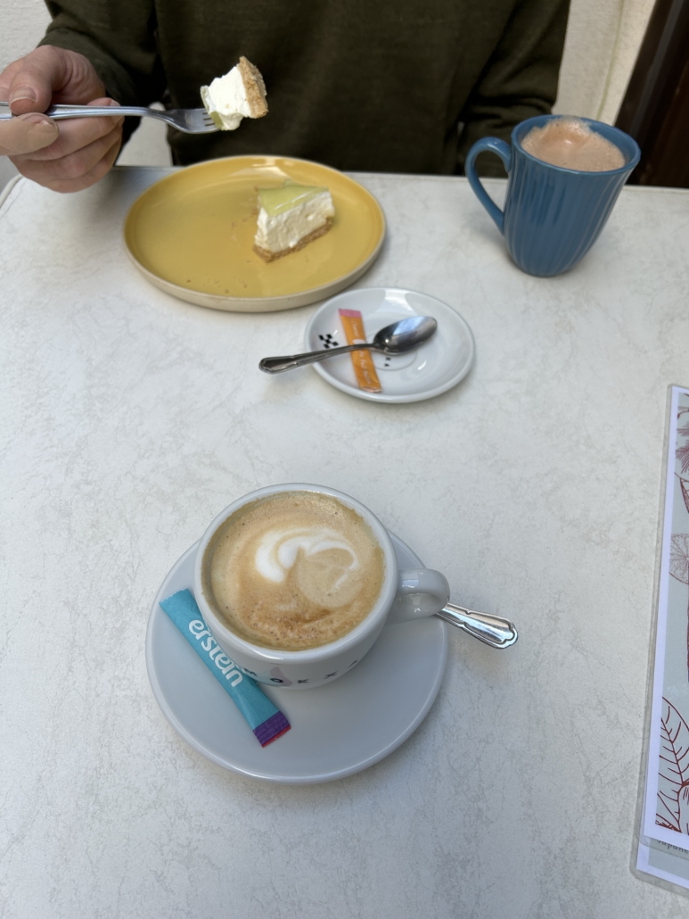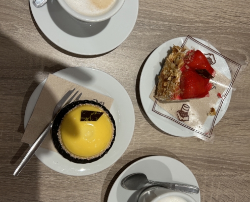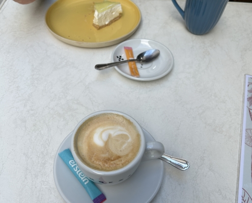 Nach dem Spaziergang fahren wir weiter zum Intermarché und kaufen ein. Auf dem Parkplatz gibt es die erste Kaffeepause mit Kougelhopf und Kokosmakronen, die wir gestern gekauft haben. Der kleine Kougelhopf ist schon etwas angetrocknet, weil wir ihn nur in einer Papiertüte aufbewahrt haben.