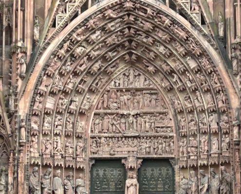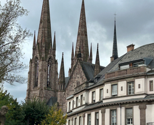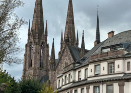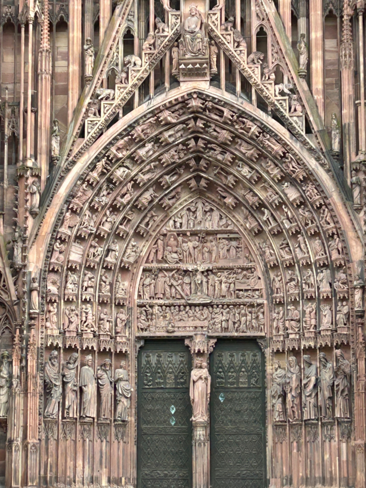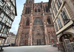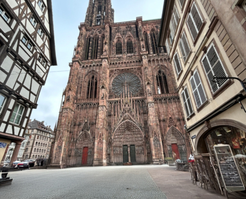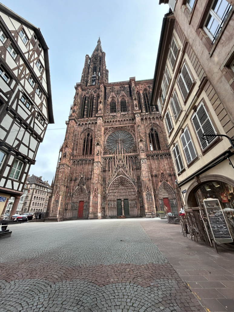 Heute erkunden wir Strasbourg mit dem Tram. Der Billettautomat ist defekt, sodass wir ohne Tickets fahren müssen. An der Haltestelle «Homme de Fer» steigen wir aus. Wir laufen zum Münster. Das Strassburger Münster, ist ein römisch-katholischer Sakralbau und gehört zu den bedeutendsten Kirchengebäuden der europäischen Architekturgeschichte sowie zu den grössten Sandsteinbauten der Welt.
