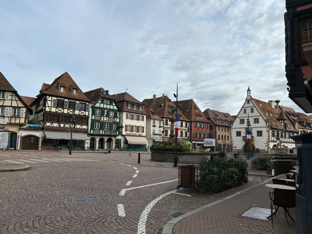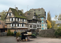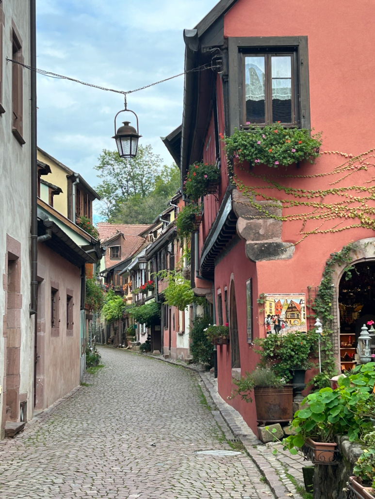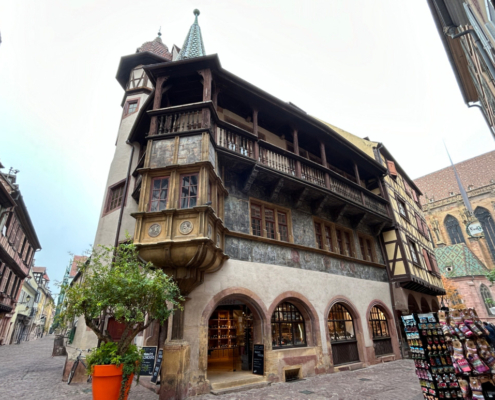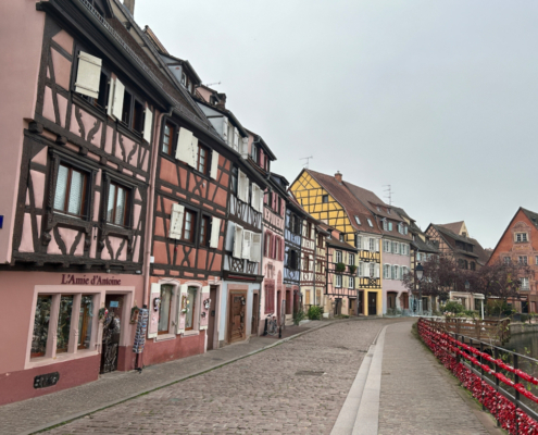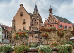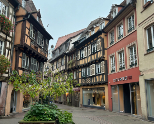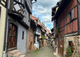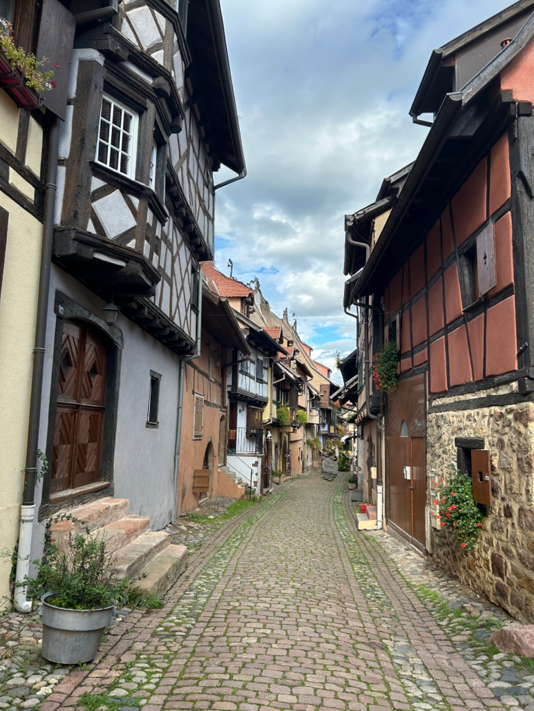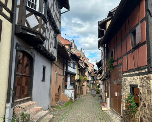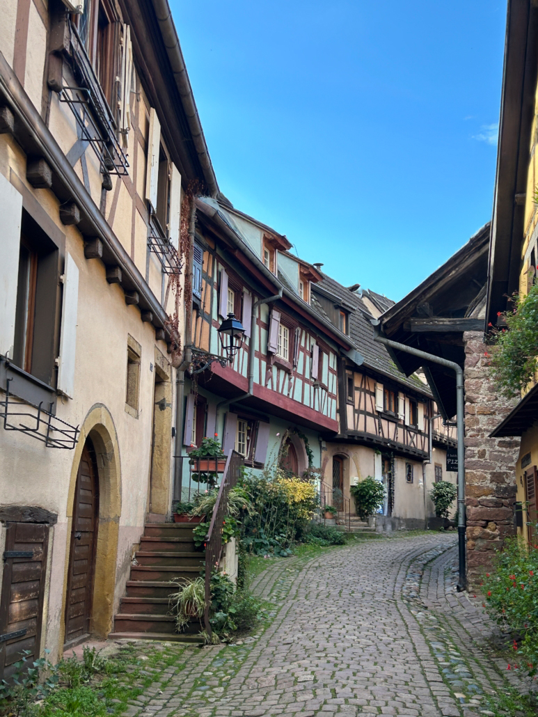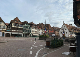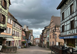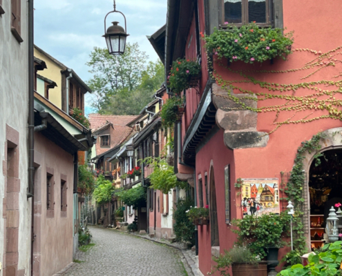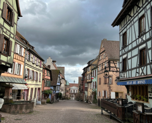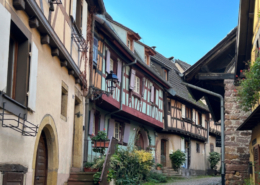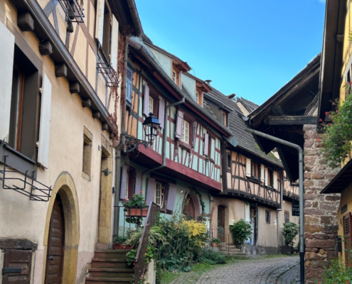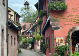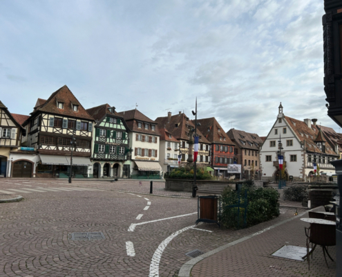 Dann fahren wir weiter nach Eguisheim. Dort gibt es einen riesigen Parkplatz mit Strom für Wohnmobile. Wir spazieren über die gepflasterten Strassen von Eguisheim, das zu den schönsten Dörfern Frankreichs gehört. Ein charmantes kleines Dorf, typisch elsässisch mit den alten Gebäuden und ihren Spitzdächern, bunten Farben und Fachwerkfassaden.