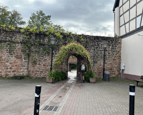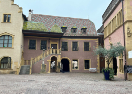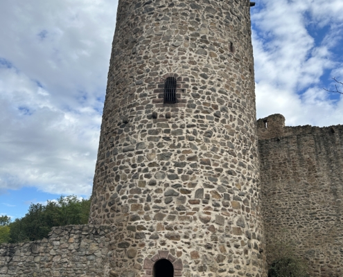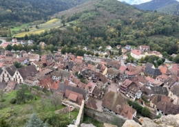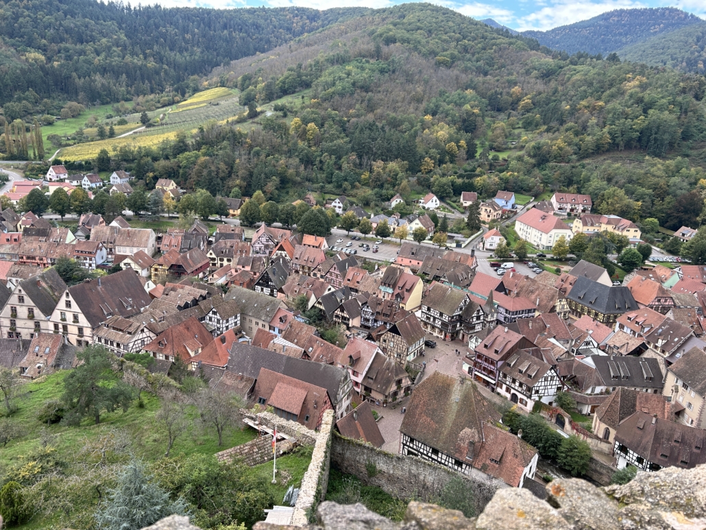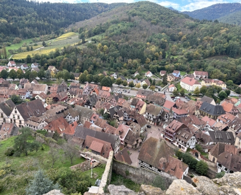 Heute machen wir mit dem Camper einen Ausflug nach Kayersberg. Wir müssen alles einpacken und verstauen. Wir starten kurz nach 10 Uhr. Dort fahren wir den gebührenpflichtigen Wohnmobil-Stellplatz an. Wir laufen durch das Städtli. Es hat nicht so viele Geschäfte wie andere Orte. Am Ende des Städtli steigen wir zur Burg und weiter auf den Turm hinauf. Von dort können wir die weite Ebene bis nach Deutschland sehen und auch das Städtli unter uns.