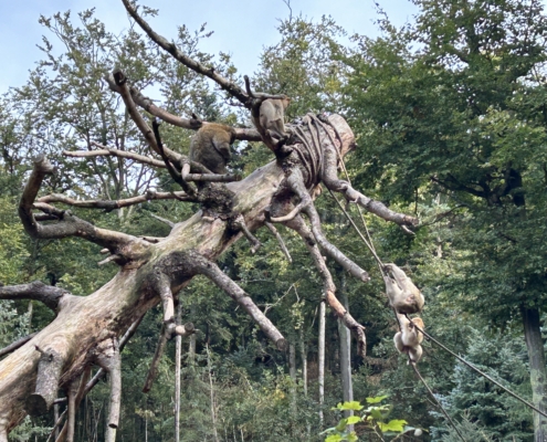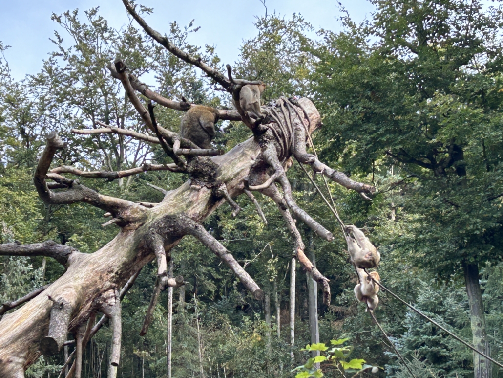 Weiter geht’s zum Montagne des Singes (€ 12.- pro Person), wo wir den Affen bei der Fütterung zusehen. Auf einem Baum spielen ein paar Affen. Den Rundgang haben wir bald beendet und fahren weiter.