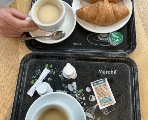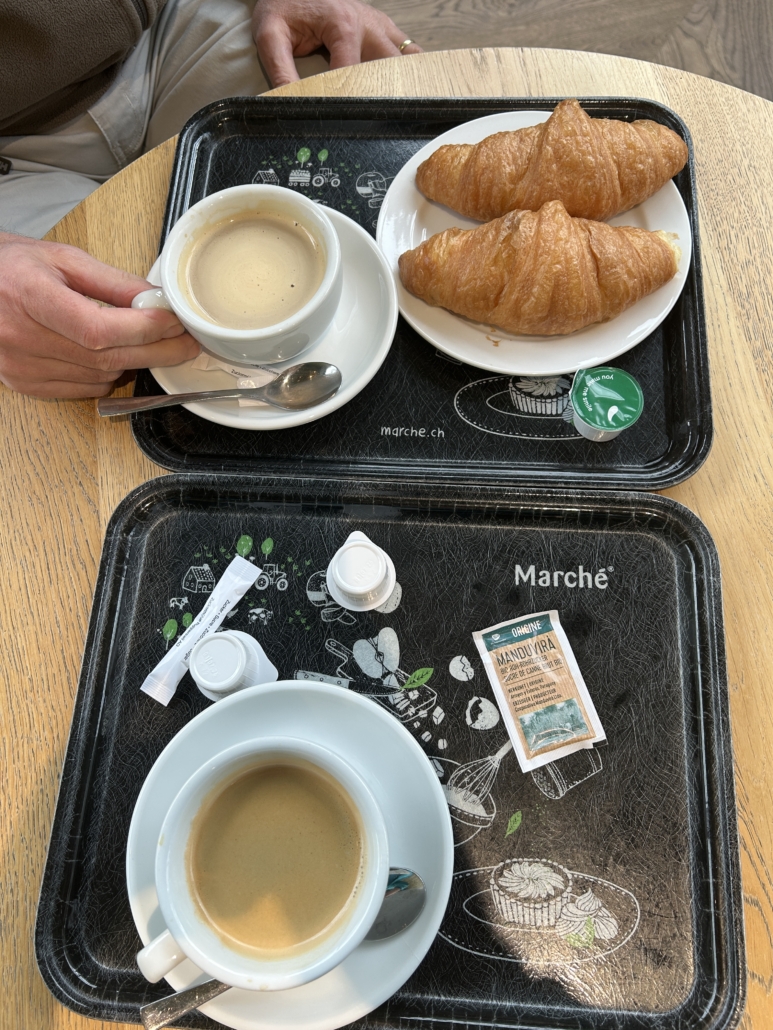 Nach dem Tanken in Gurmels (43.55 l à 1.74 = CHF 75.78) geht es Richtung Genfersee. Um 10:30 Uhr legen wir auf der Raststätte La Côte eine Znünipause ein. Kaffee mit Gipfeli (CHF 2 x 4.70 und 2 x 1.80) sorgen für einen angenehmen Zwischenhalt.