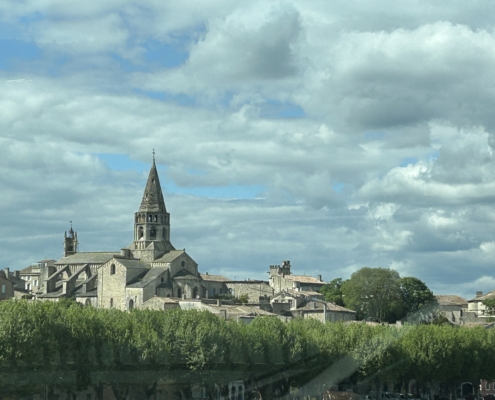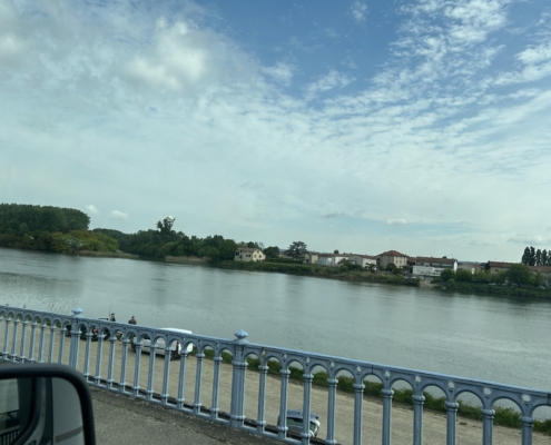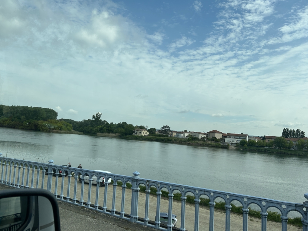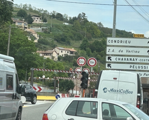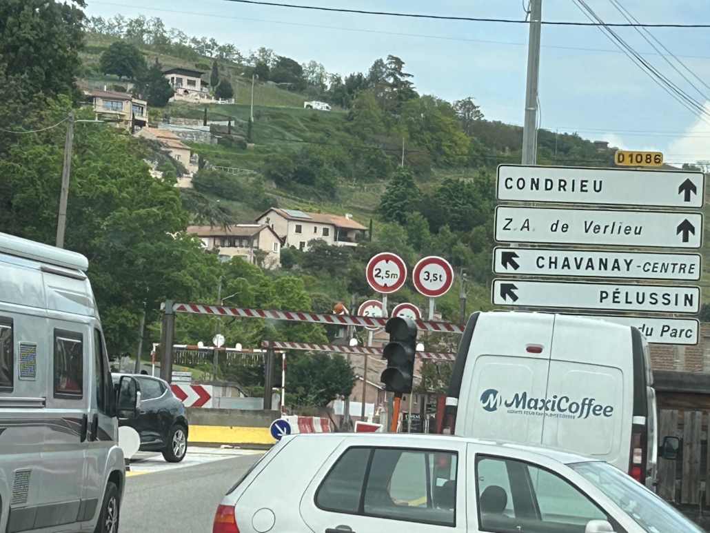 Für die Péage bezahlen wir € 15:30 und verlassen die Autobahn bei Annonay um unseren Sohn und seine Freundin zum Mittagessen zu treffen. Die letzten Meter müssen wir zu Fuss gehen, da eine Brücke wegen Bauarbeiten auf 2,5 m Höhe beschränkt ist.