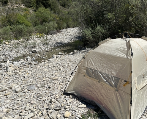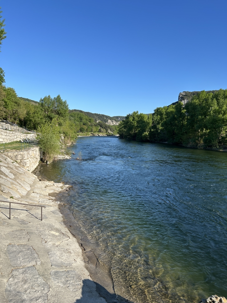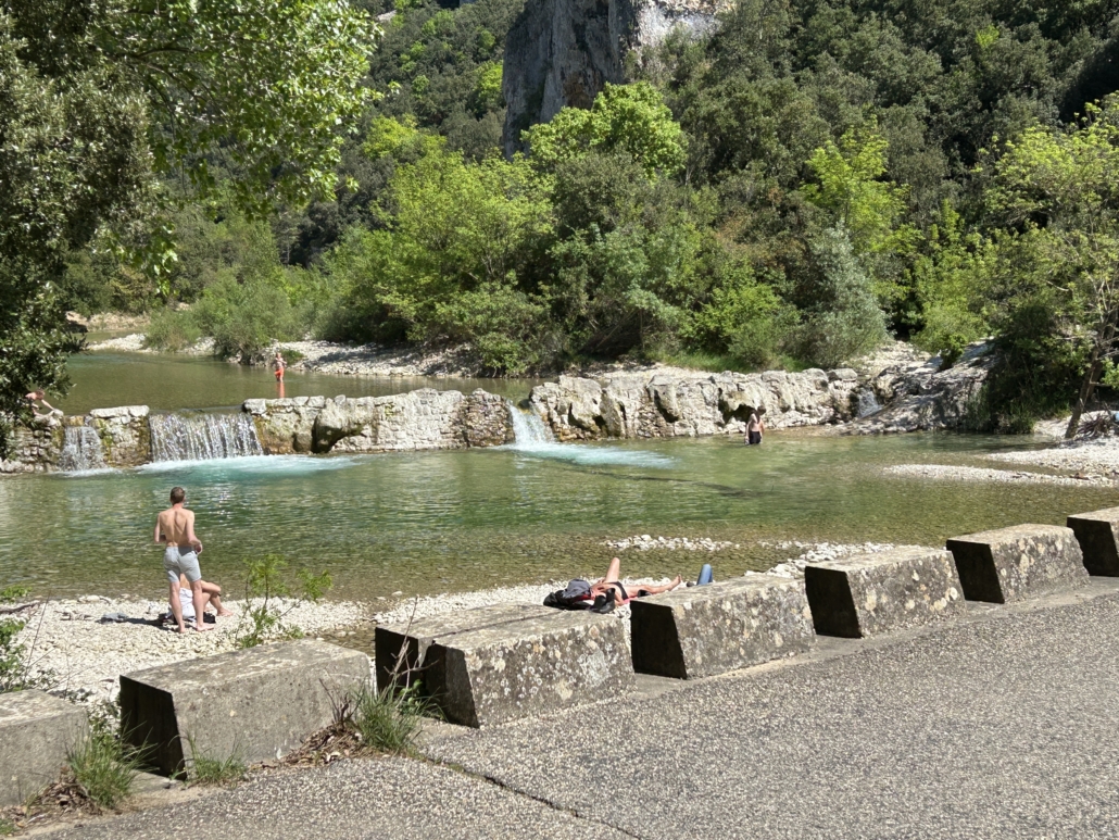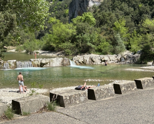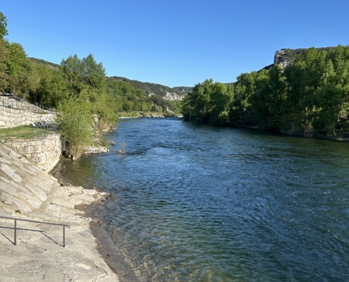 Nach dem Abwasch erkunden wir den Campingplatz. Die L’Ardèche grenzt direkt an den Platz. Vor rund 26 Jahren waren wir schon einmal mit dem Wohnwagen hier.